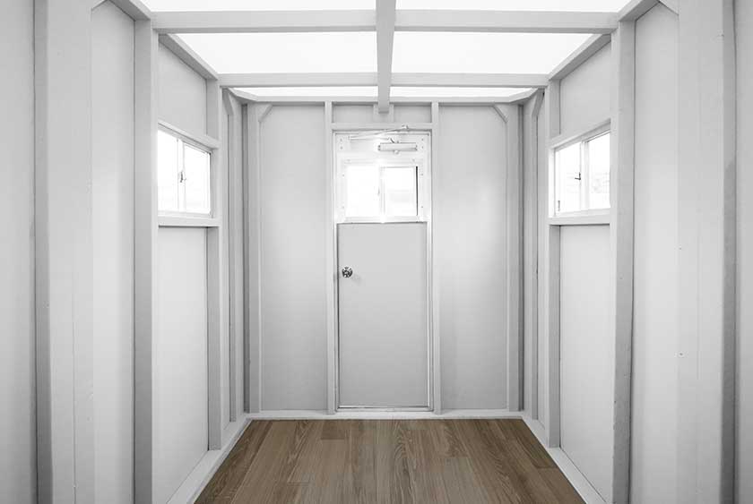 Once inside the A48, you will immediately notice it has a very spacious 48-square foot interior. The interior walls come with a high gloss cherry wood finish or a painted interior to match the exterior color. The two flooring options include a beautiful Armstrong faux wood or faux tile. There is a pull chain porcelain light fixture to provide plenty of light plus a two-way 110-volt electrical outlet.