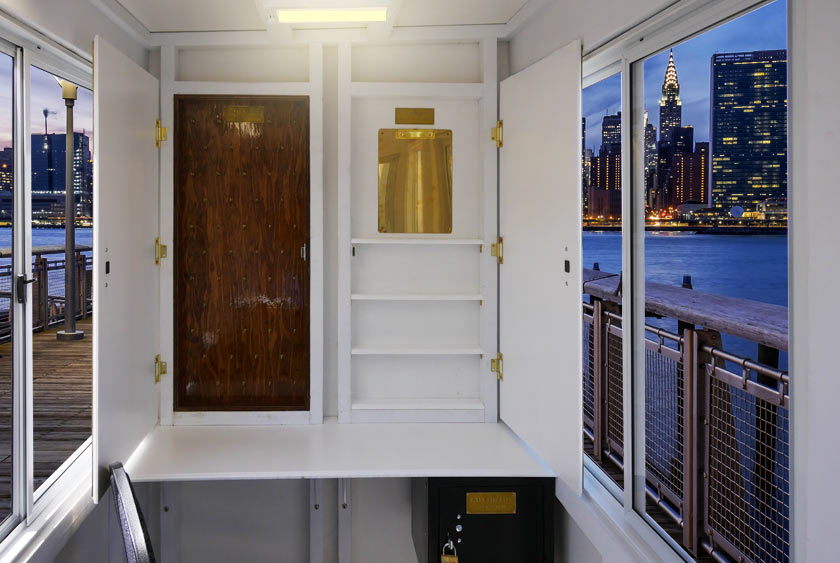 Commercial grade aluminum auto close lockable door • Exterior door key locking system • Appliques, crown moldings, base moldings, corner moldings and picture frame moldings • brass or stainless moldings around the windows and door • Two interior cabinets – One cabinet with 50 brass key hooks; One cabinet with four shelves and mounted clip board holder • Wall mounted safe to secure valuable items using a padlock (padlock available upon request) • Brass or stainless doorknob • Standing seem roof • CALLAHEAD brass or stainless signage plates • Stelpro thermostat controlled 1500 watt fan forced heater • Door Window – 23” x 17” (Fixed) • Four sliding lockable aluminum windows with screens – 36” x 36” each • Porcelain LED pull chain light fixture • Four way 110v interior electric outlet • Windows on three sides for superior outside viewing • Armstrong faux wood flooring or faux tile • Oversized interior for a comfortable work space for multiple valet staff, and chairs • CALLAHEAD New York custom signage on the exterior emulating the best valet key booth rentals