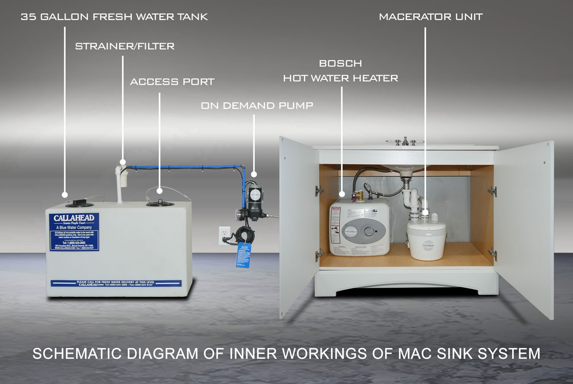 CALLAHEAD’s uses non-potable water. CALLAHEAD believes all tank water must be considered non-potable, non-drinkable water and must never be consumed. The only water to be consumed in New York should be bottled spring water, filtered water from upstate New York water sheds, or filtered well water. No one should EVER drink tank water on a boat, plane, motor home, or inside a New York construction office trailer with any portable sink system. CALLAHEAD is providing three separate non-consuming water signs with every installation of the MAC SINK SYSTEM. These signs are designed to ensure all users understand the ’s water should NOT be used for human consumption. Non-potable water means water can NEVER be used to drink, cook with, or even make coffee. Please ensure everyone at the construction site understands this critical issue for their safety.