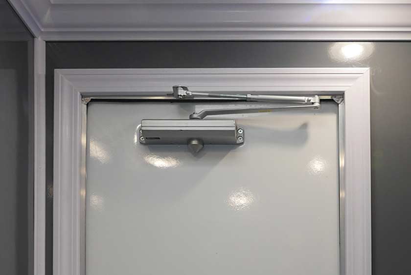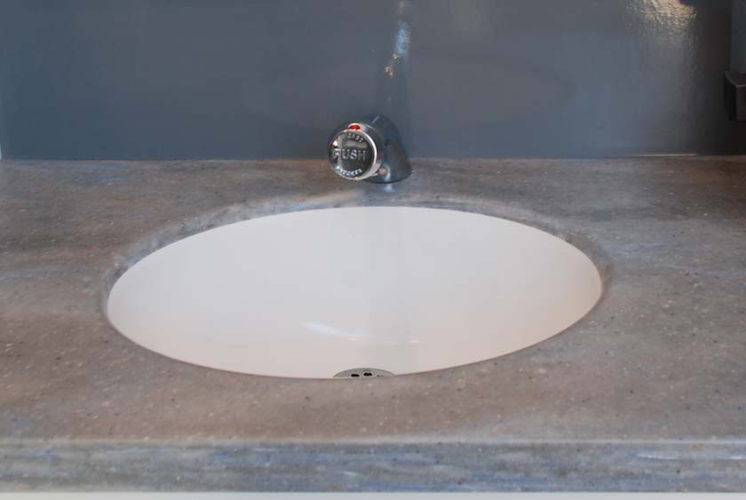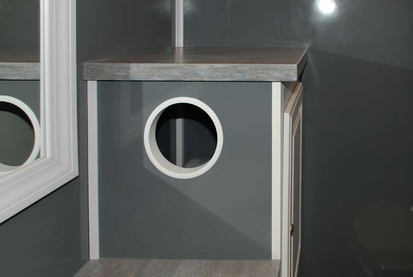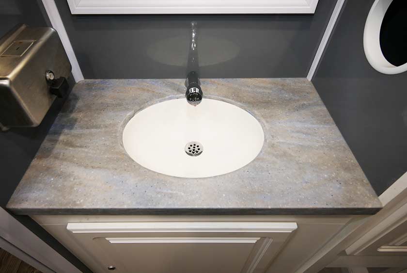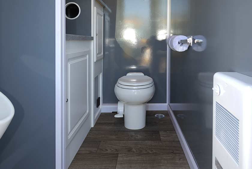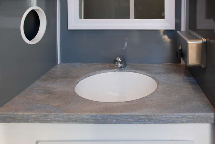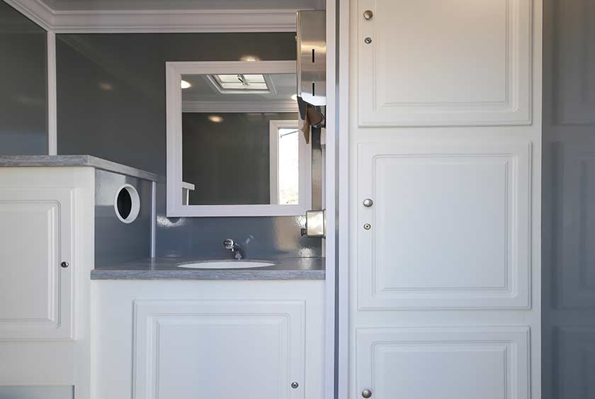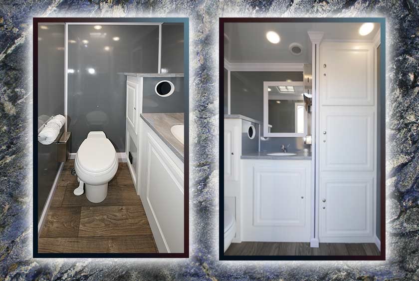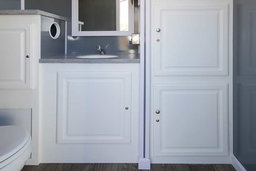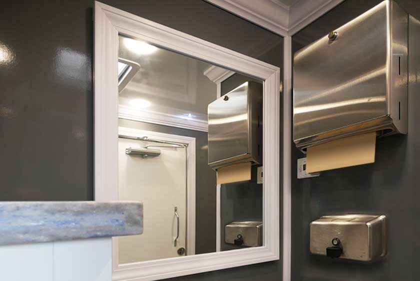 Both the women's and men's restrooms inside the offer a single home bathroom feel. They have Corian vanity countertops with a porcelain sink basin. The Chicago brand single lever faucet in each restroom will deliver hot and cold running water. Wall mounted stainless soap, and towel dispensers are just above the sink for easy access. The vanity area has a built-in trash receptacle to help keep the restroom clean. There is even plenty of shelving space to place personal items when using the bathroom. Each restroom has a vanity mirror directly above the sink plus storage cabinets are available for supplies. The solid wood white vanity storage cabinets have brushed nickel knobs. The 's gray, high-gloss smooth interior walls wipe easily clean. The white wood trim work extends throughout the restrooms. The wide planked faux wood Armstrong flooring adds to the homelike restroom design. The brings comfortable sanitation combined with CALLAHEAD's hospital grade cleaning service to deliver the best portable restroom trailer experience at the construction site.