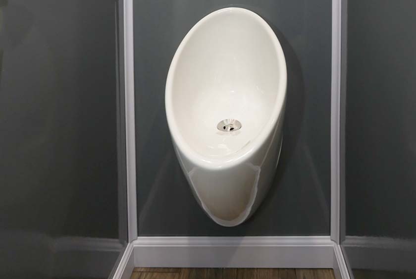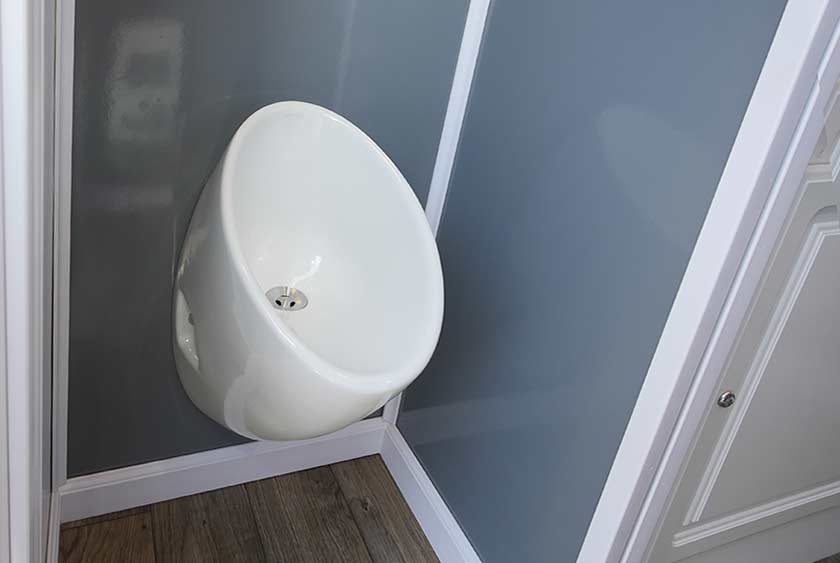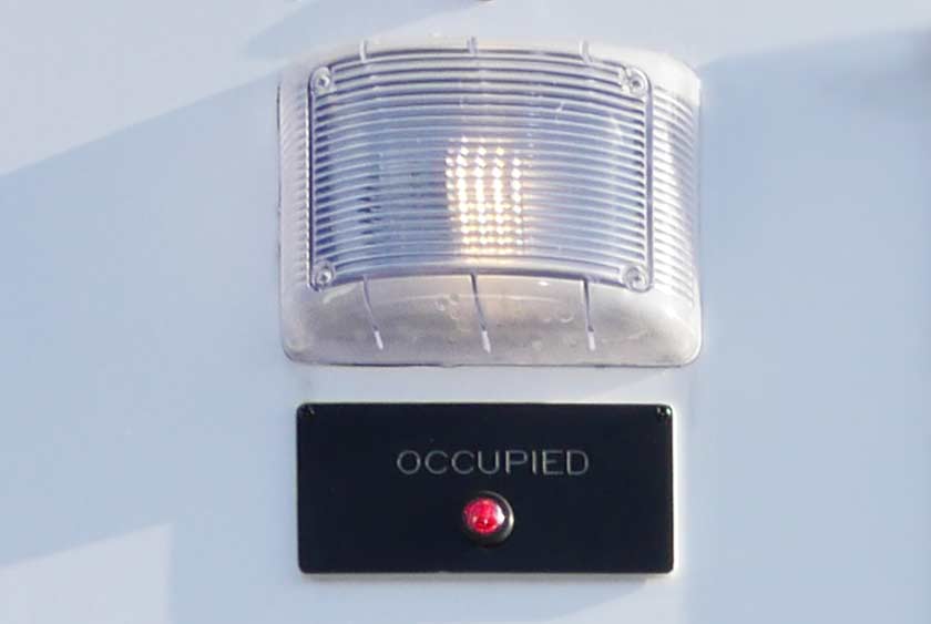 The women's side has an extra-large private bathroom equipped with a porcelain toilet and vanity sink area. The self-closing door locks from the inside and illuminates the exterior occupancy sign for assured privacy. The full-size porcelain flush toilet bowl has a pedal flush for hands-free operation. The double toilet paper holder is located conveniently near the toilet bowl. The men's room is also an oversized private restroom. Inside the men's restroom are a porcelain flush toilet bowl, vanity sink, and a Kohler waterless porcelain urinal. The men's urinal is ideally placed on the opposite side of the room away from the toilet and surrounded by walls on three sides for privacy.