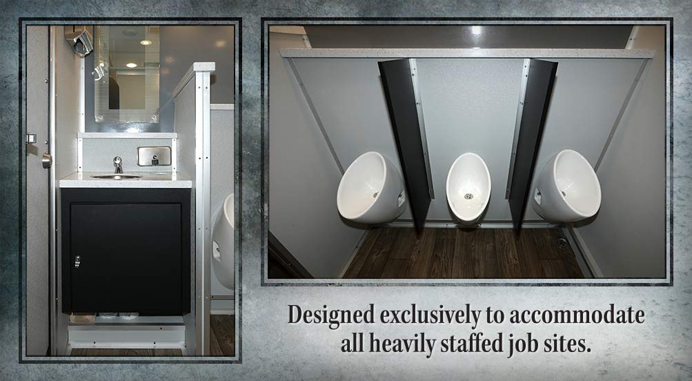 The have separate women’s and men’s entrances with wide floating staircases, and stainless steel handrails. The self-closing doors include CALLAHEAD’s signature signage to represent the best sanitary restroom trailers in the industry. The is the ideal rental for any large construction job such as high-rise buildings, shopping malls, bridges and tunnels or other big job in need of restroom trailers.