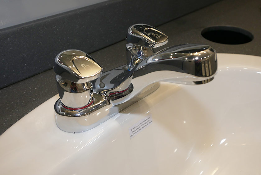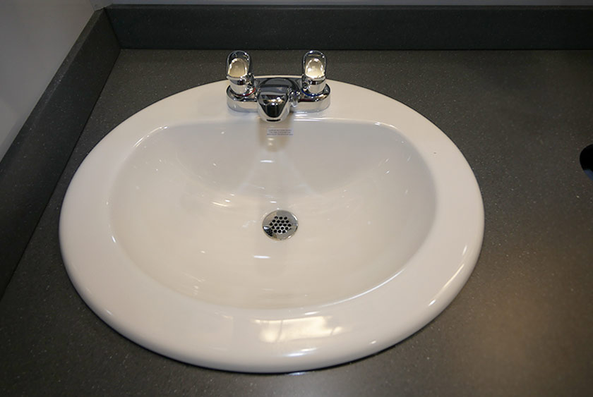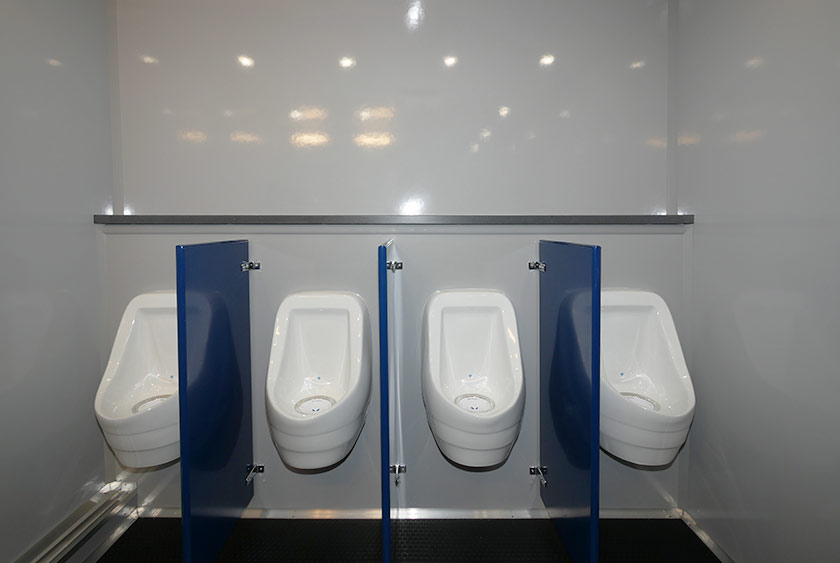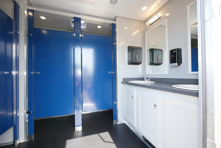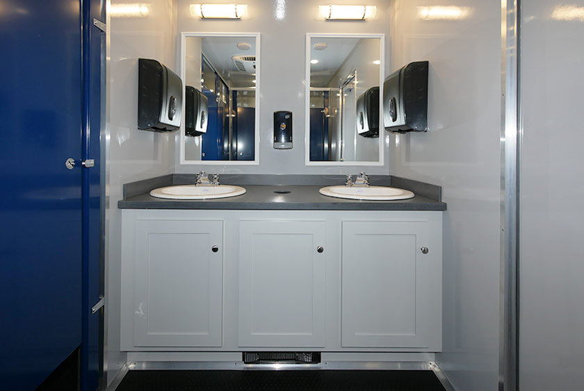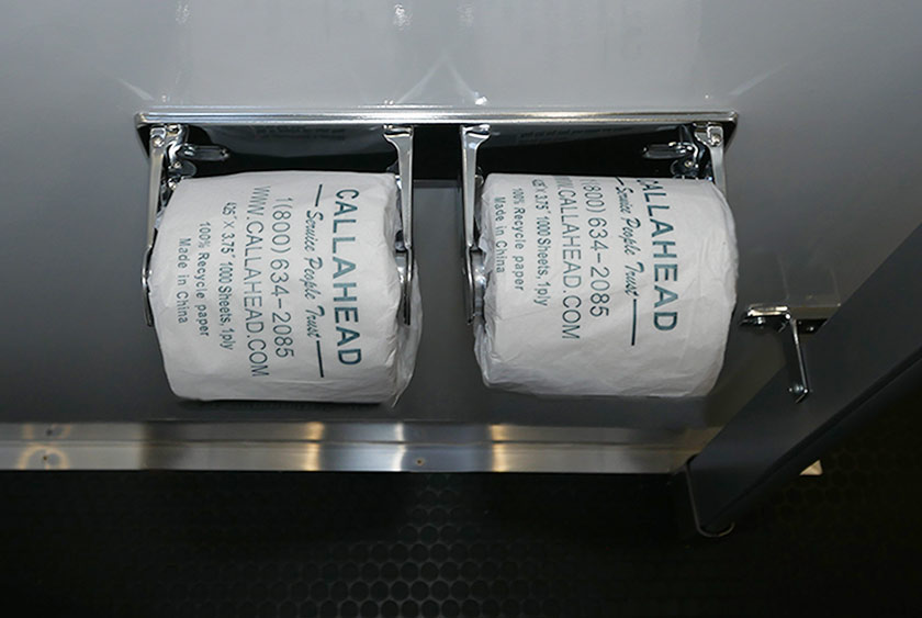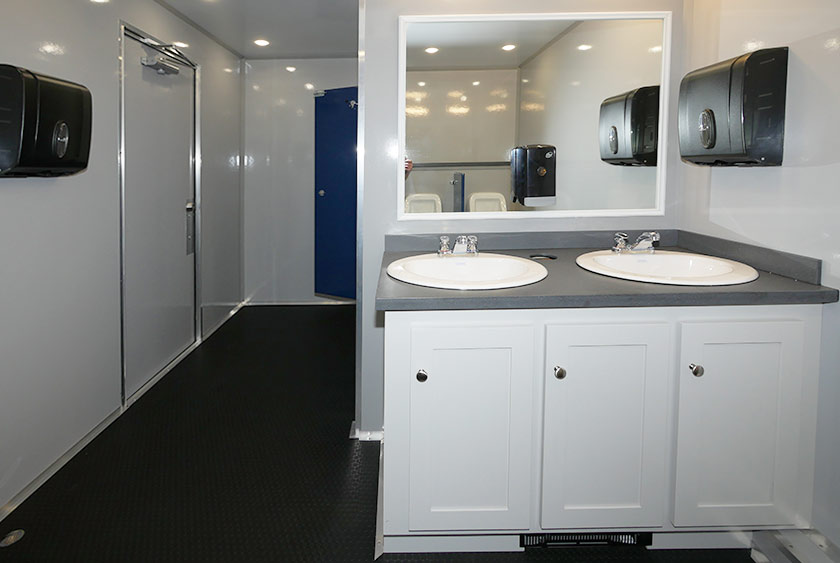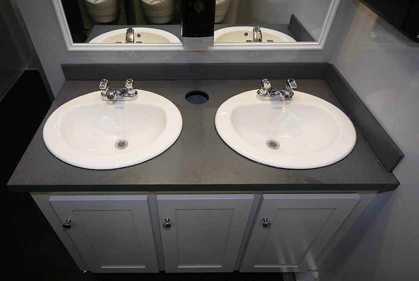 Each self-closing door has CALLAHEAD’s signature signage on the exterior revealing the very best restroom trailers in the industry. The women’s and men’s side have two porcelain sinks in each restroom. The Moen auto shut-off faucets provide hot and cold water options. All vanity areas include wall mounted filled soap and hand towel dispensers. There are vanity mirrors over the sinks with stylish horizontal wall sconces. The Corian countertops have a built-in trash receptacle to help keep the restroom and vanity area clean. There is additional storage space beneath the sinks for extra supplies. The has rubberized laminate commercial flooring to handle heavy-duty traction at the job site.