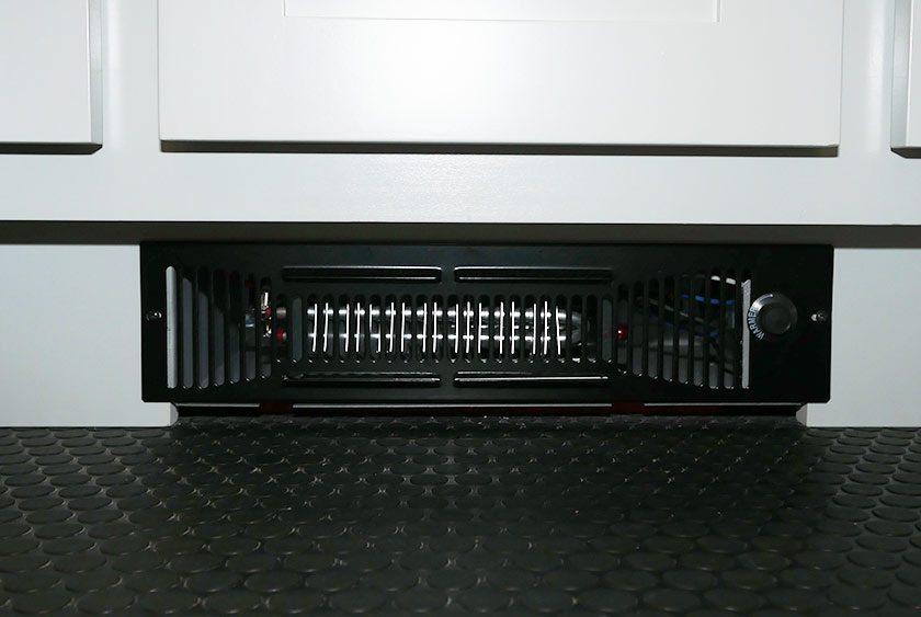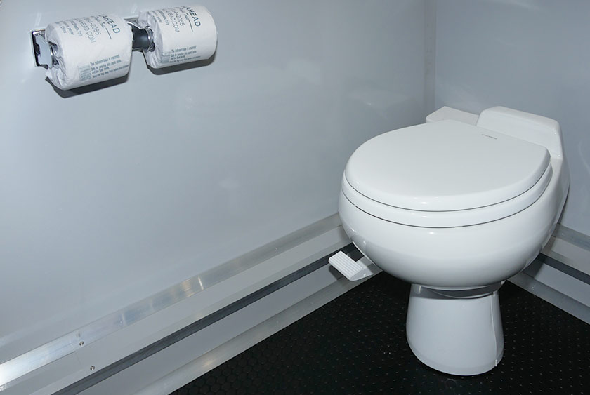 There are LED high-hat ceiling lights throughout the entire restroom trailer. A 1500 BTU Coleman Mach heat and air conditioning system of the is thermostat controlled. Two 1500 Watt toe-kick heaters add an extra layer of warmth inside the restroom trailer during New York’s bitterly cold winter months. The runs from a generator or standard 110 Volt outlet.